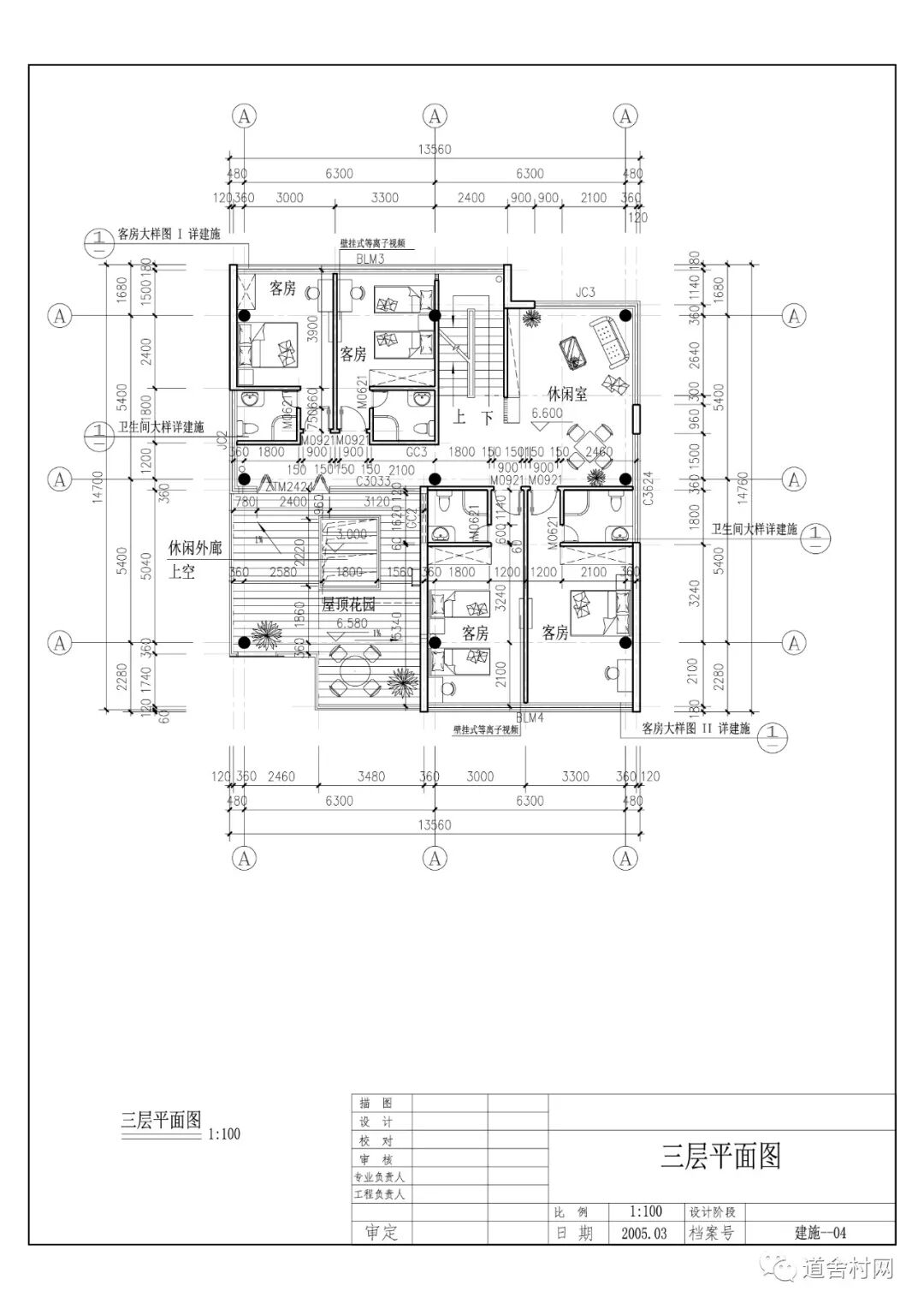 我们再来看看三层功能,三层南北向各设有两个带独立卫生间的客房,西南角设有屋顶花园,东北角设有休闲区。
