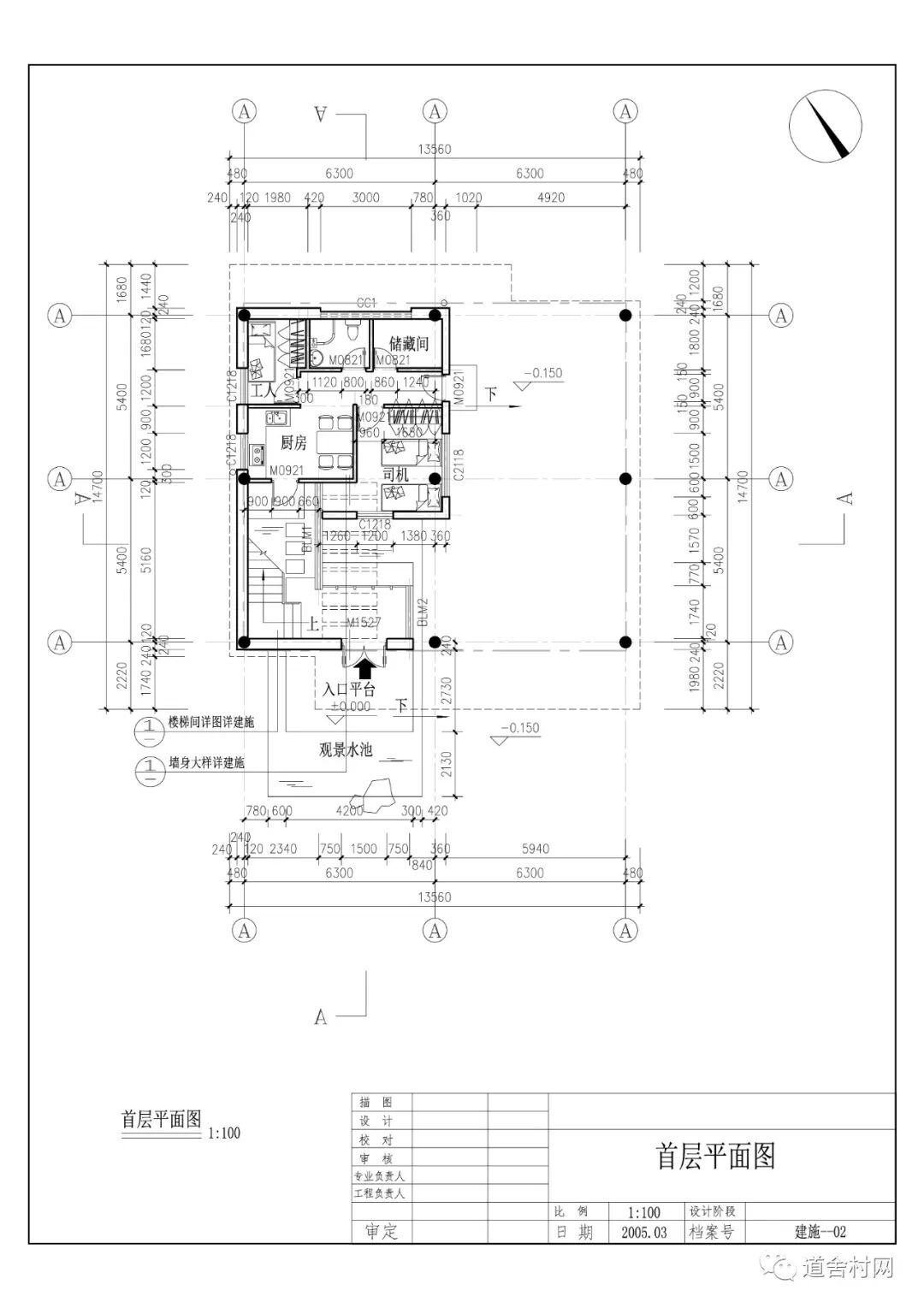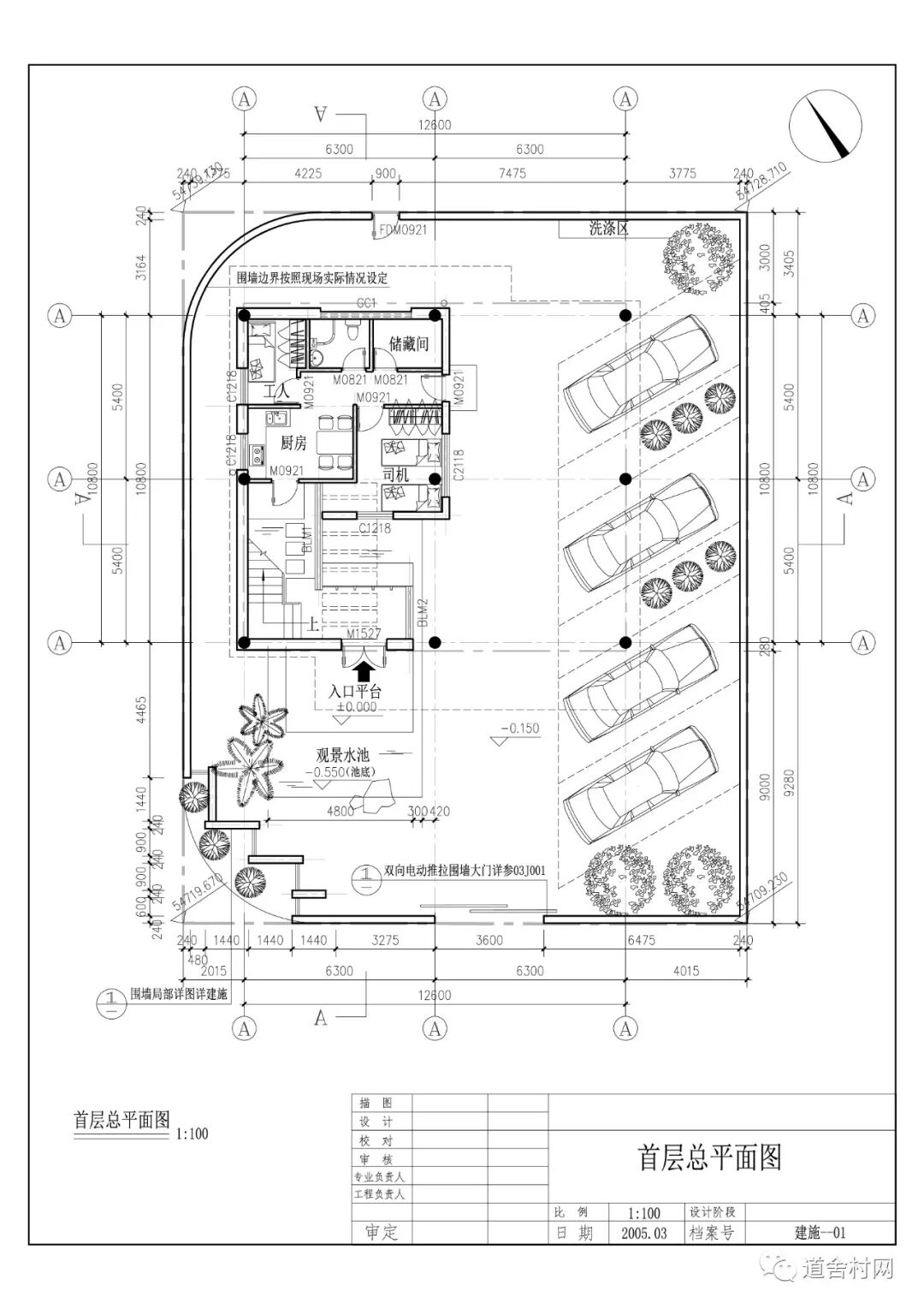 我们来看看建筑施工图功能布局,先来看看首层平面功能布局,从大门进来左手边是楼梯,上楼上的,楼梯往北走是厨房餐厅,带单独出入口,工人房、司机房、储藏间和卫生间。首层主要是供佣人用的,与屋主人交通流线上做了分流。