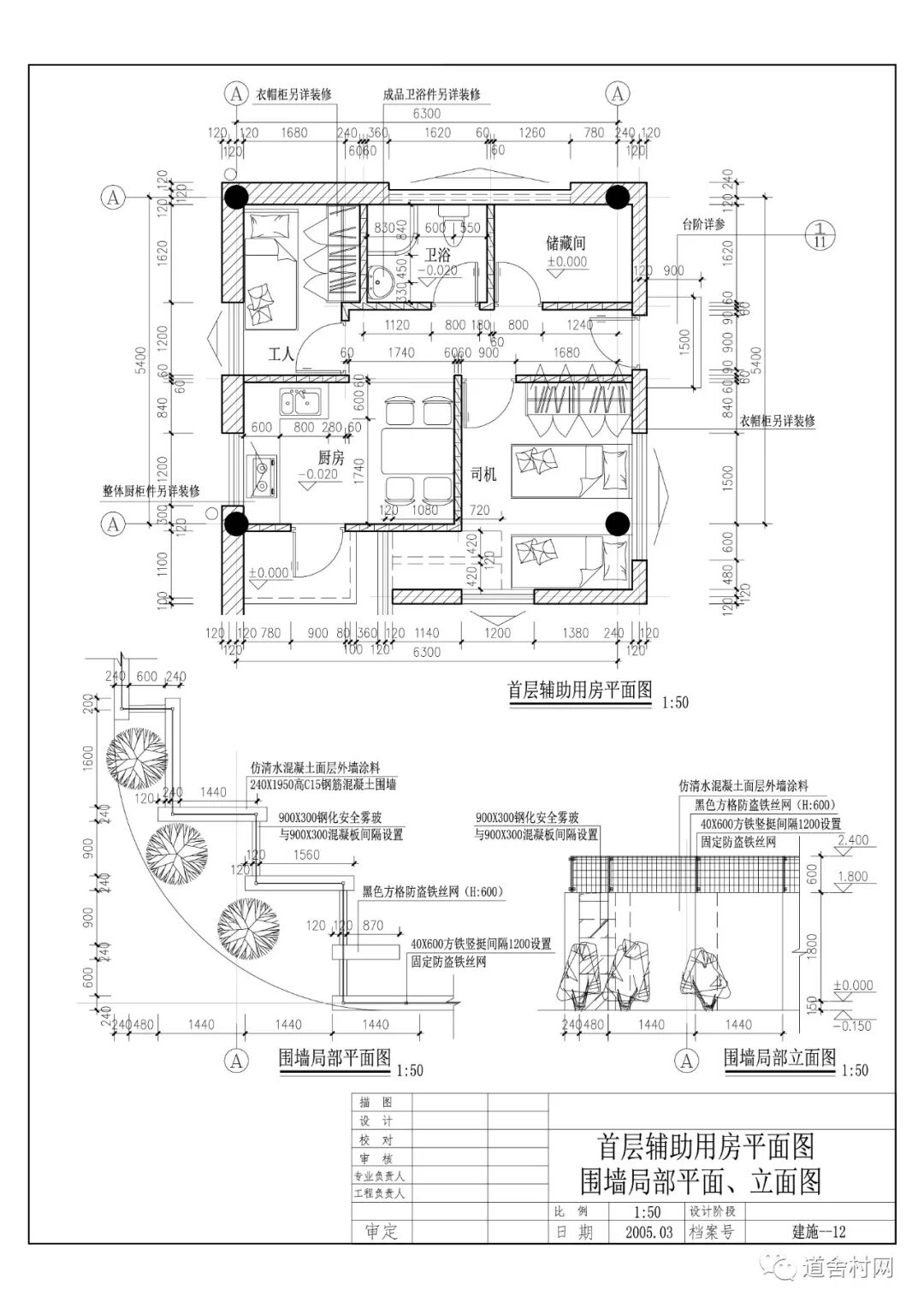 这是首层辅助用房平面图和围墙局部平面、立面图