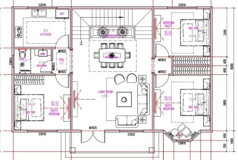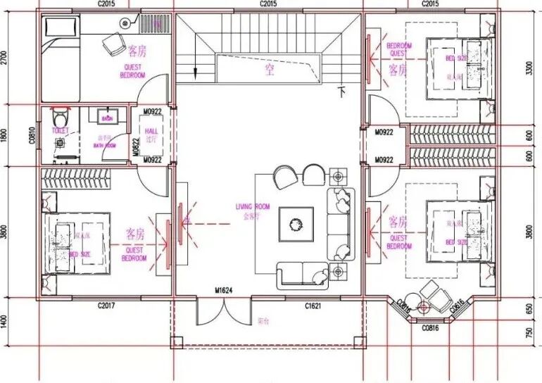 其中西北角、西南角分别设有一间卧室。正西向设有干湿分离公卫,且设在两卧室中间,方便家人使用。
