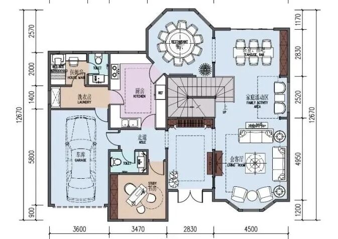 正东向是你家家庭活动区,正北向餐厨房隔断,餐厅也是独立八角窗设计,西北角是你家保姆房带独立卫生间,洗衣房单独设置,干净又卫生。正南向设有一间书房,方便你家孩子阅读学习,西南角是你家劳斯莱斯幻影私家车库,出库东边设有一间公共卫生间。可惜无法自然采光通风,