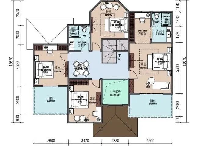西北角设有一间干湿分离的公卫,且设在两卧室中间,方便家人使用。西南角设有一间卧室,东南角设有一间卧室带衣帽间加独立卫生间加阳台,阳台可夏乘凉秋赏月,中间部分是你家二楼起居室。
