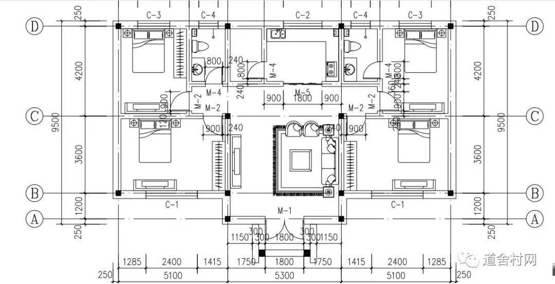 我们先来看看这套农村自建房一层设计图纸。开间16米,进深9.5米。四室两厅一厨两卫一门廊。这是一个欧式农村一层自建房。入户设有门廊,并设有三步台阶,入户进来是你家客厅,客厅以北餐厨房隔断,西北角、西南角分别设有一间卧室,西北角卧室以东设有一间公共卫生间,东南角、东北角分别设有一间卧室,东北角卧室以西设有一间公共卫生间。