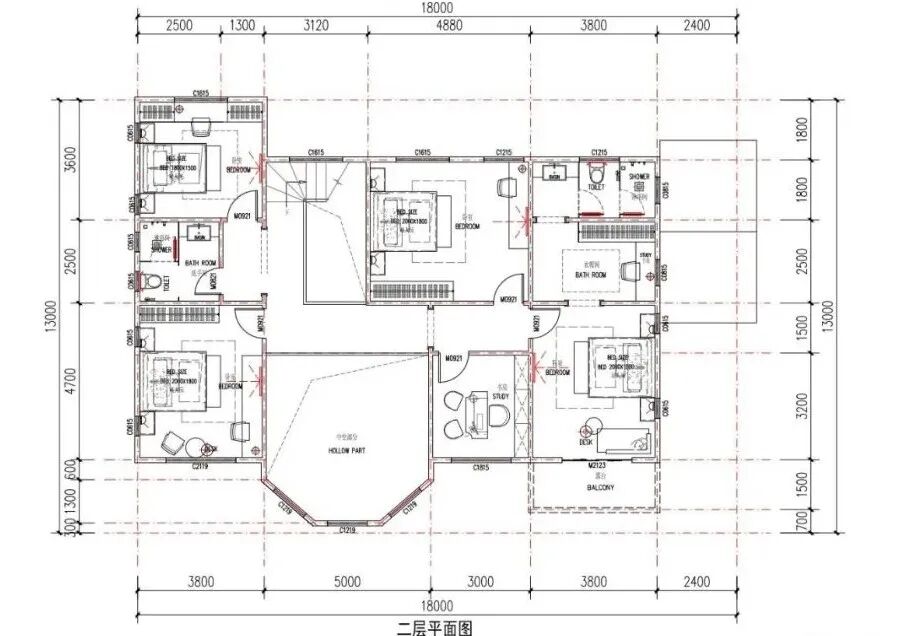 其中西北角西南角分别设有一间卧室,喜欢就点点关注,设计盖房不迷路。
