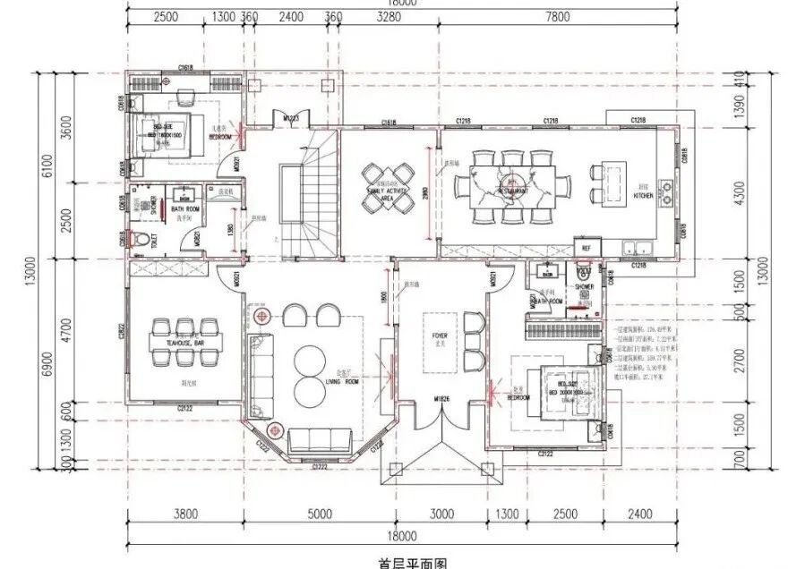 欢迎光临一楼,两室两厅一厨两卫一茶室酒吧一家庭活动区一玄关。