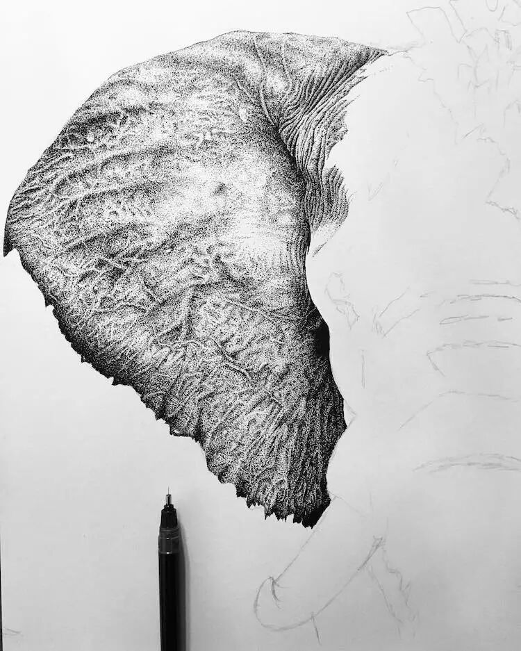 这幅历时8个月的素描作品,是一位名叫Nicholas Baker的插画家所绘制的作品。这幅画是用黑色墨水笔一点,一点的点出来的,这幅画的点高达数百万个。