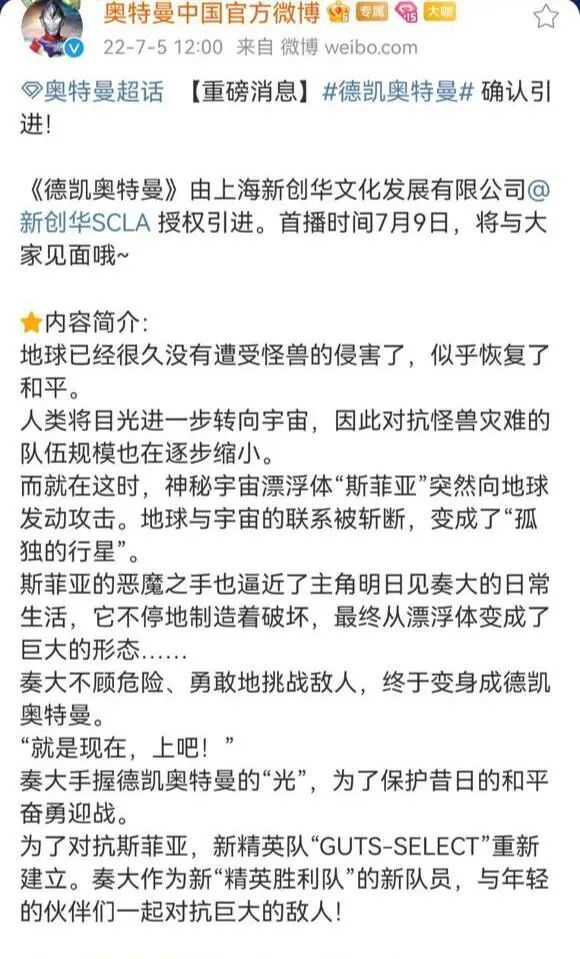 戴卡奥特曼的拍摄工作早就完成了,实际上就连特别篇都拍摄完了。今年戴卡奥特曼之所以如此迅速就是因为国内的审核机制,为了能够同步在国内上映,圆谷那边也是提前了戴卡奥特曼的拍摄工作。而在今天官方也是放出了通知,确定了戴卡奥特曼7月9号国内会同步配信,这个消息对于很多粉丝来说还是很棒的!