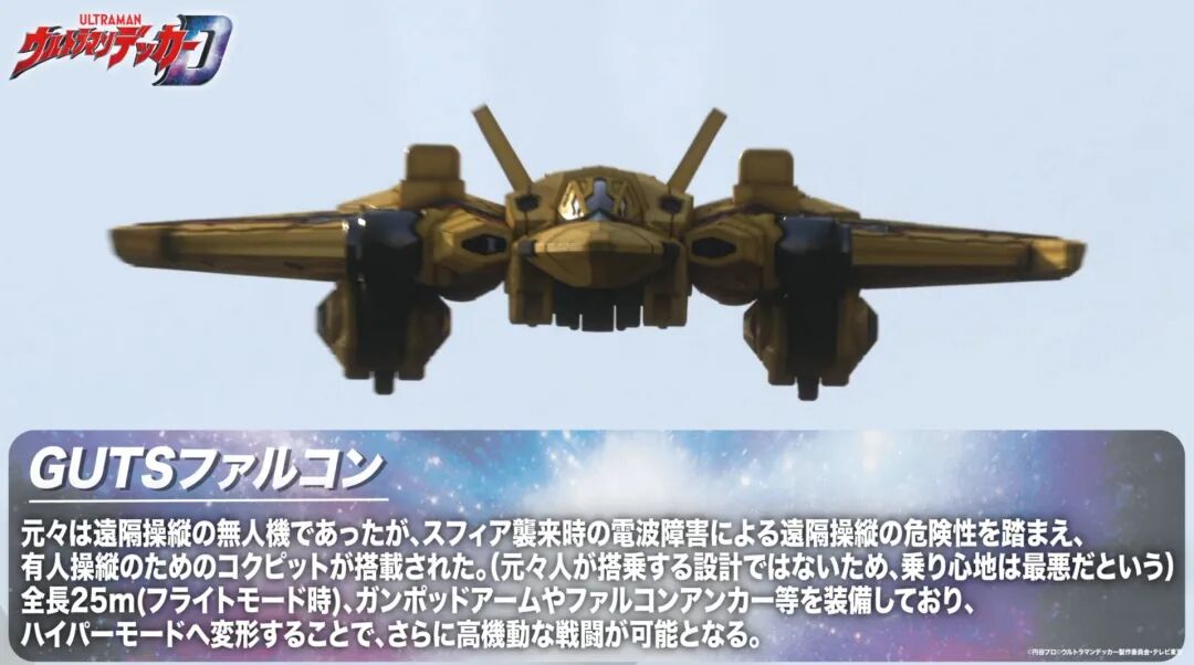 <GUTS猎鹰>原本为远程操作的无人机,由于索菲亚袭击的影响,导致远程操作具有危险性,现搭载了有人操作的驾驶室。飞行模式全长25米,装备有猎鹰锚、机舱外机械臂等武器。可以变成超级模式,拥有高机动战斗的能力。