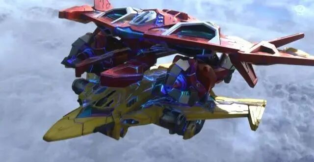 之后就是飞鹰号整个机身来了个360度的贴身大翻转,直接贴到了胜利猎鹰号的下面,而其底部类似钳子一样的装置贴合在了上面,相当于是给胜利猎鹰号额外追加了一层酷炫还很实用的红色外装甲。