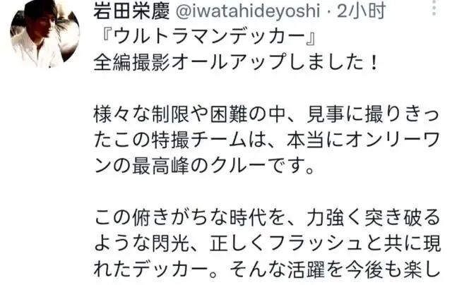 先简单翻译一下,本次全篇的拍摄全部结束了!在各种各样的限制和困难中,出色地完成了今年的拍摄任务,德凯奥特曼拍摄结束,可以说算是完成了一项艰巨而伟大的任务,今后的拍摄任务估计会更加的辛苦,今后也期待着继续活跃在这个平台上。
