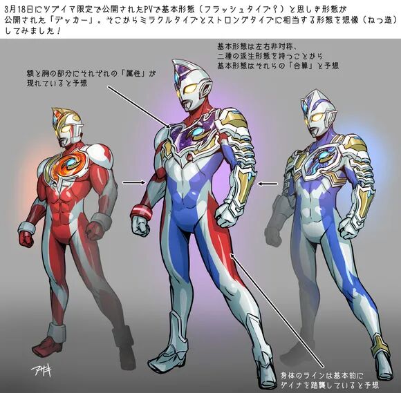 接着就是黑田妄想设计的德凯奥特曼三个形态了,闪亮型的话没有任何区别,强壮型的话突出了火元素,没有配备盔甲,而奇迹型的话注重的是水元素,这里倒是配备了盔甲,正好和剧中的相反。