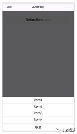 var items = ['item1', 'item2', 'item3', 'item4']var pageObject = { data: { actionSheetHidden: true, actionSheetItems: items }, // 用于显示和隐藏ActionSheet actionSheetTap: function (e) { this.setData({ actionSheetHidden: !this.data.actionSheetHidden }) }, // 点击“取消”按钮或ActionSheet的外部区域,会调用该函数 actionSheetChange: function (e) { console.log('actionSheetChange') this.setData({ actionSheetHidden: !this.data.actionSheetHidden }) }, bindItem1: function (e) { console.log("单击了item1"); this.setData({ actionSheetHidden: !this.data.actionSheetHidden }) }, bindItem2: function (e) { console.log("单击了item2"); this.setData({ actionSheetHidden: !this.data.actionSheetHidden }) }, bindItem3: function (e) { console.log("单击了item3"); this.setData({ actionSheetHidden: !this.data.actionSheetHidden }) }, bindItem4: function (e) { console.log("单击了item4"); this.setData({ actionSheetHidden: !this.data.actionSheetHidden }) }}Page(pageObject)