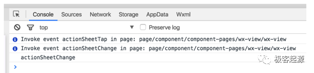 显示ActionSheet后,当点击“取消”按钮或ActionSheet外部区域,会在Console中输出如图2所示的日志信息。然后ActionSheet会隐藏(因为actionSheetHidden变量被设为true)。