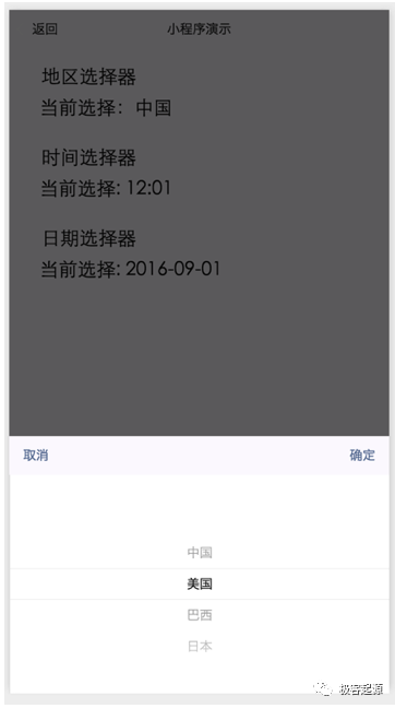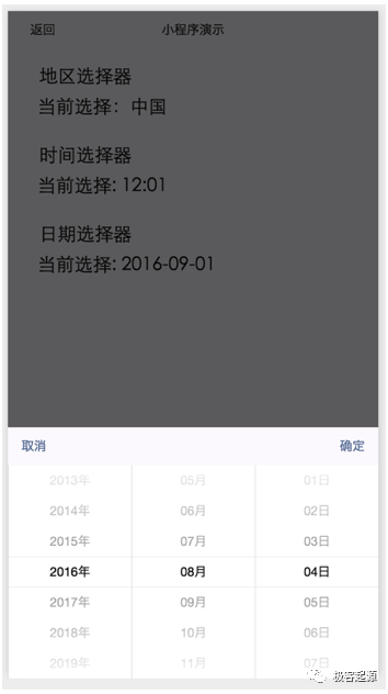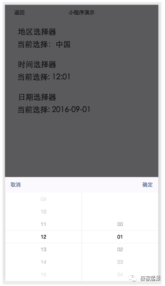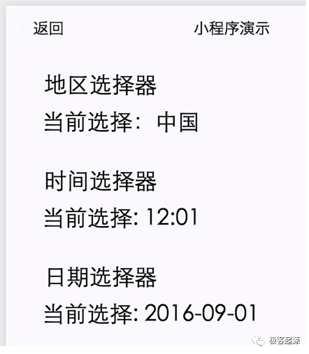 <view style="margin:20px"> <view style="margin-left:15px">地区选择器</view> <picker bindchange="bindPickerChange" value="{{index}}" range="{{array}}"> <view style="padding: 13px;"> 当前选择:{{array[index]}} </view> </picker></view><view style="margin:20px"> <view style="margin-left:15px">时间选择器</view> <picker mode="time" value="{{time}}" start="09:01" end="21:01" bindchange="bindTimeChange"> <view style="padding: 13px;"> 当前选择: {{time}} </view> </picker></view><view style="margin:20px"> <view style="margin-left:15px">日期选择器</view> <picker mode="date" value="{{date}}" start="2015-09-01" end="2017-09-01" bindchange="bindDateChange"> <view style="padding: 13px;"> 当前选择: {{date}} </view> </picker></view>