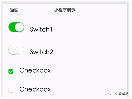 <view style="flex-direction:column;display:flex"> <label><switch style="margin:20px;" checked="{{switch1Checked}}" bindchange="switchChange"/> <text>Switch1</text> </label> <label><switch style="margin:20px;" checked="{{switch2Checked}}"bindchange="switchChange" /> Switch2 </label> <label><switch style="margin:20px;" checked="{{switch1Checked}}" bindchange="switchChange" type="checkbox" />Checkbox </label> <label><switch style="margin:20px;" checked="{{switch2Checked}}" bindchange="switchChange" type="checkbox" />Checkbox </label> </view>