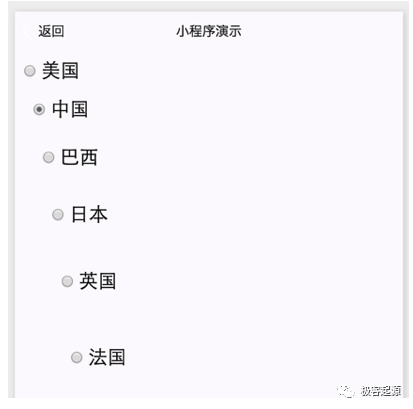 Page({ data: { items: [ {name: 'USA', value: '美国', margin:10}, {name: 'CHN', value: '中国', checked: 'true',margin:20}, {name: 'BRA', value: '巴西',margin:30}, {name: 'JPN', value: '日本',margin:40}, {name: 'ENG', value: '英国',margin:50}, {name: 'FRA', value: '法国',margin:60}, ] }, // 相应radio组件变化的函数 radioChange: function(e) { console.log('radio发生change事件,携带value值为:', e.detail.value) }})