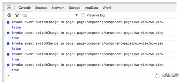 当点击switch组件时,会在Console中输入如图5所示的日志信息。如果经测试发现,尽管点击switch组件后的文本可以触发switch组件,但却无法触发change事件,这可能是一个bug,估计以后版本会有所改进。
