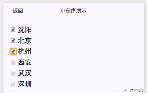 Page({ data: { items: [ {name: 'shenyang', value: '沈阳',checked: 'true'}, {name: 'beijing', value: '北京'}, {name: 'hangzhou', value: '杭州'}, {name: 'xian', value: '西安'}, {name: 'wuhan', value: '武汉'}, {name: 'shenzhen', value: '深圳'}, ] }, checkboxChange: function(e) { console.log('checkbox发生change事件,携带value值为:', e.detail.value) }})