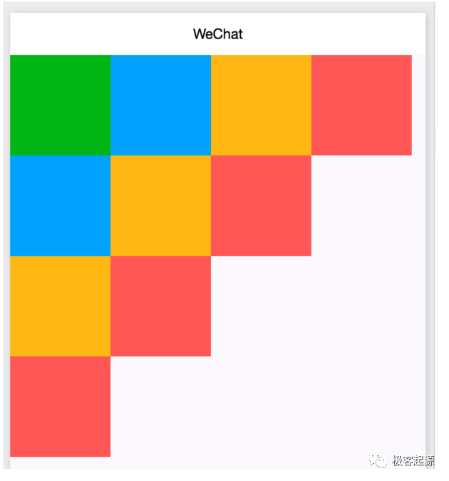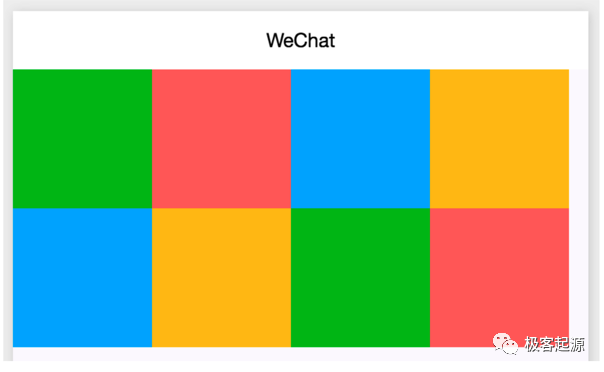 <view style="display:flex;flex-direction:row"> <view class="bc_green" style="width:100px;height:100px" /> <view class="bc_red" style="width:100px;height:100px" /> <view class="bc_blue" style="width:100px;height:100px" /> <view class="bc_yellow" style="width:100px;height:100px" /></view><view style="display:flex;flex-direction:row"> <view class="bc_blue" style="width:100px;height:100px" /> <view class="bc_yellow" style="width:100px;height:100px" /> <view class="bc_green" style="width:100px;height:100px" /> <view class="bc_red" style="width:100px;height:100px" /></view>
