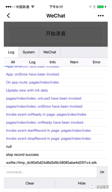 要注意的是,小程序模拟器对录音支持的并不好,因此,需要使用真机测试本节的例子。开启小程序真机调试模式后,点击“开始录音”按钮,弄出点声音,然后再点击“停止录音”按钮,会在真机的Console中输入如图1的临时音频文件路径。