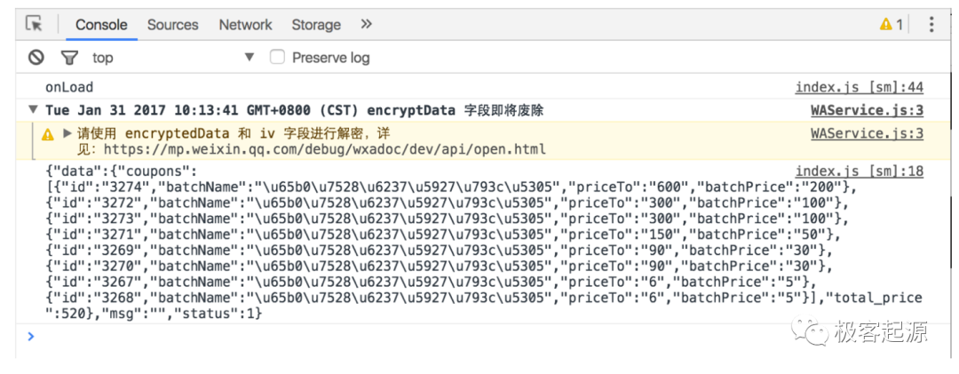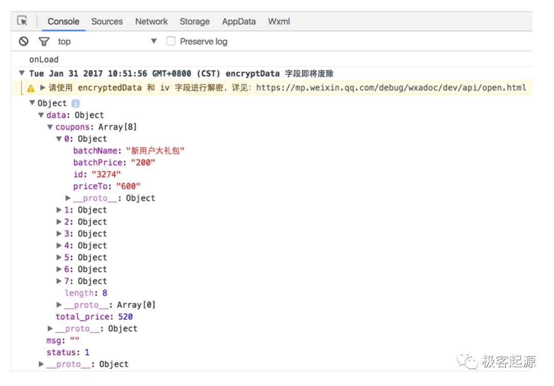 按着返回的JSON格式的数据,已经将其解析成相应的对象和数组格式。例如,如果要获取data对象中coupons数组第一个元素的batchName属性的值,可以使用下面的代码。