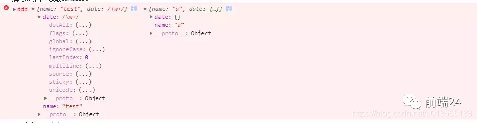 const test = { name: 'a', date: new RegExp('\\w+'),};// debuggerconst copyed = JSON.parse(JSON.stringify(test));test.name = 'test'console.error('ddd', test, copyed)