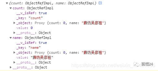 <script>//引入需要的APIimport { reactive, toRefs } from 'vue'export default { name: 'home', setup() { //通过reactive定义响应式对象 const obj = reactive({ count: 0, name: '廊坊吴彦祖' }) //通过toRefs将obj中的所有属性创建为ref const refObj = toRefs(obj) console.log(refObj) //通过return暴露出去,供template中使用 return { obj, refObj } }}</script>