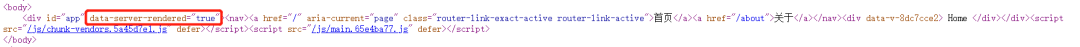 查看网页源代码发现根元素上添加了一个特殊的属性:data-server-rendered,该属性让客户端 Vue 知道这部分 HTML 是由 Vue 在服务端渲染的,并且应该以激活模式进行挂载