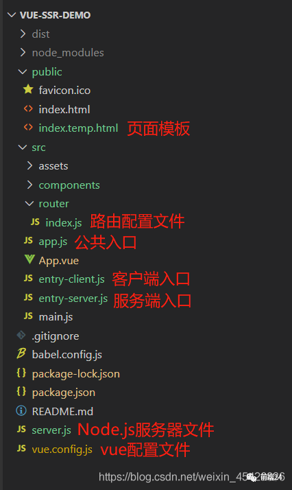 构建流程:所有的文件拥有一个公共入口 app.js,进入服务端入口 entry-server.js 和客户端入口 entry-client.js ,项目完成后通过使用 webpack 打包生成服务端 server bundle(一个供服务端 SSR 使用的 json 文件)和客户端 client bundle(用于浏览器),当请求页面时,服务端将 vue 组件组装成 HTML 字符串发送到浏览器,混入到客户端访问的 HTML 模板中,完成页面渲染