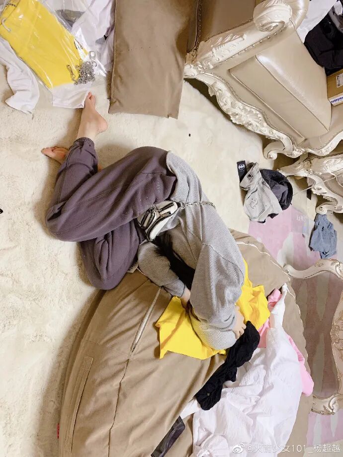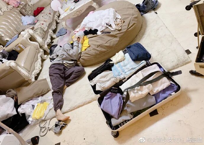 照片里,杨超越双手遮着眼睛,崩溃地倚靠在懒人沙发上,显然也是对如何收拾无从下手。