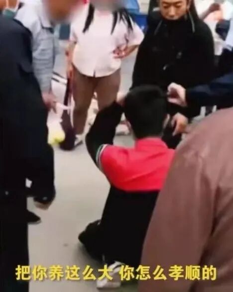 最终,一位男子忍不住出手,一把制止住少年,将他跪倒在地,并怒斥道:“把你养这么大,你怎么孝顺的?”