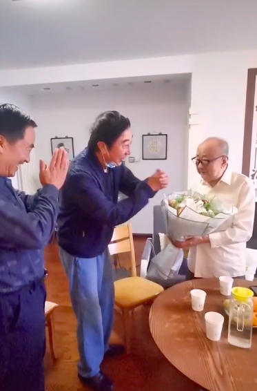 一进门,冯巩就向89岁的恩师送上了一大束鲜花,并祝福老师节日快乐。
