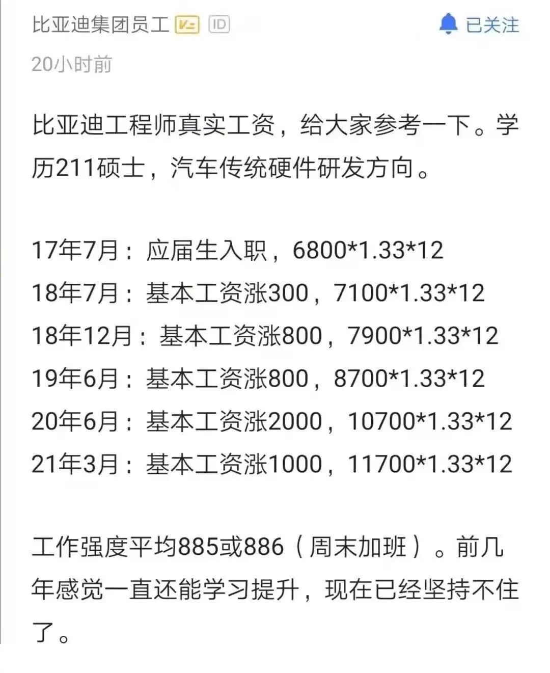 帖子在网上曝光后,不少网友直呼不敢相信:在比亚迪在职4年的工程师工资才这么少?
