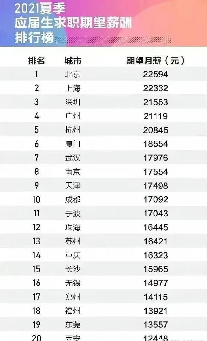 排名前20的城市中,没有一个城市的期望薪资低于10000元,前5个城市的应届求职期望薪资更是高于20000元。