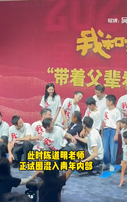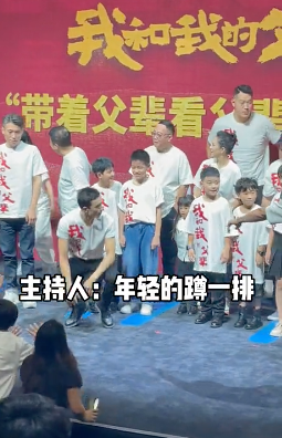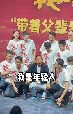 将年轻后辈演员推往中间后,陈道明更是主动走向前排,和前排年轻人一起蹲下身,还放话说自己就是年轻人。
