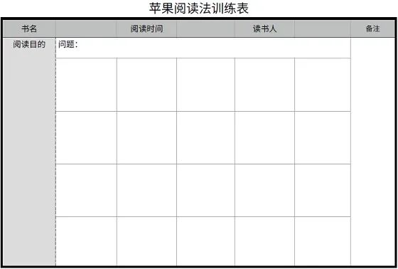 如上图所示,是一张“苹果阅读法训练表”。先写好要读的书名、阅读时间、读书人;然后思考,想通过读这本书解决什么样的问题。