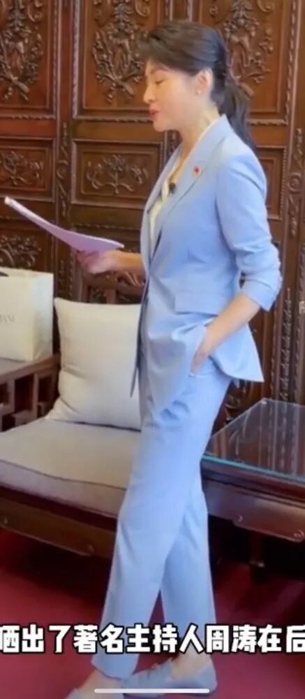 照片中,周涛身穿浅蓝色西装套装,一手握着稿子,专心致志地朗读着。