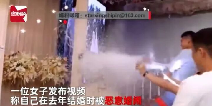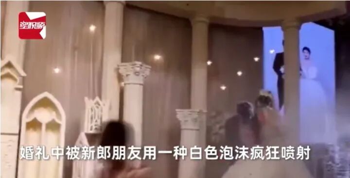 从视频可以看出,在婚宴上,女子和新郎被朋友用一种白色泡沫疯狂喷射。