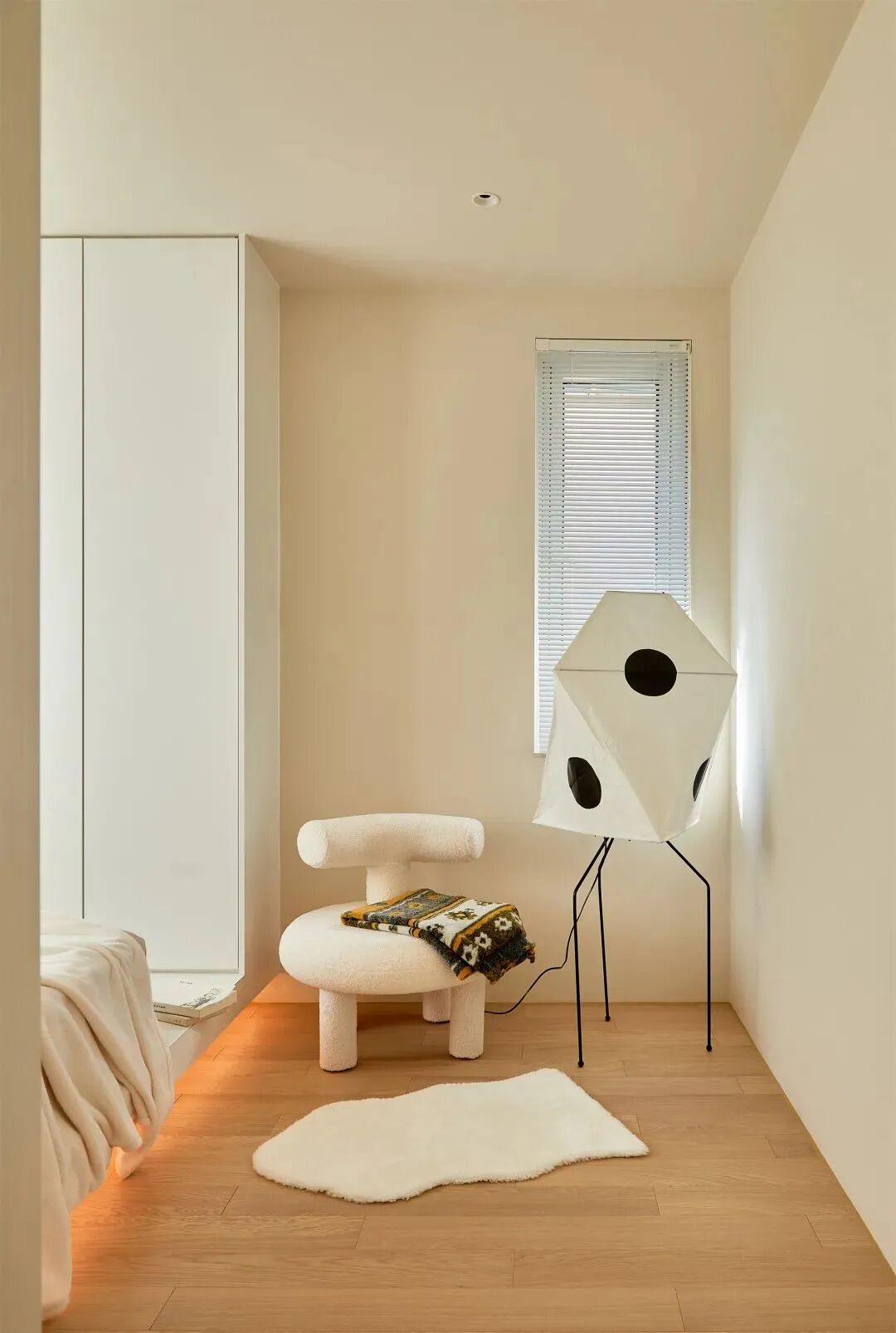 卧室除了放置床,在角落里还摆放了单人沙发和落地灯。虽然房屋空间有限,但有一个沉思阅读的角度对于灵魂的释放来说太重要了。