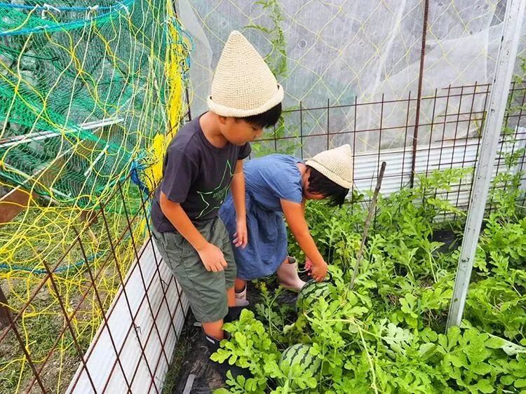 一家人在院子前开辟了一片菜地,他们让孩子在春天播下西瓜种子,感受田间劳作的快乐。