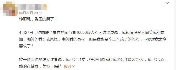 直播间的粉丝见状,都努力地安抚她的情绪,但钟丽缇依旧难以平复。