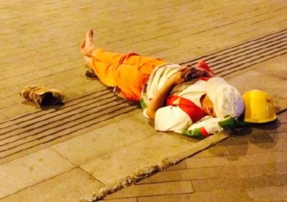 深夜的北京商业街头,一位清洁工枕着路沿,席地而眠。