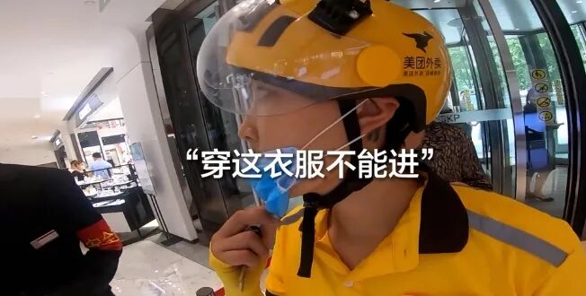 但她准备进入商场时,当场就被拦住了,只因为她穿了外卖员的工作服。