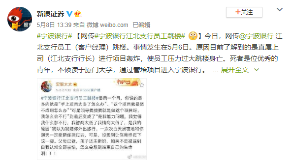 5月6日,宁波银行江北支行一名客户经理跳楼身亡,震动了整个金融行业。