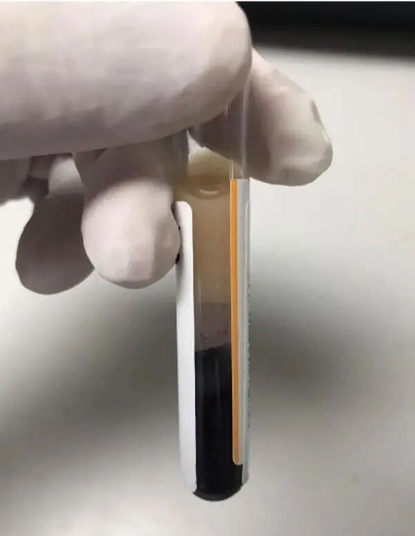 就医后,医生抽血化验,发现男子血液在试管中分层明显,上层竟悬浮着油脂样的乳糜血。