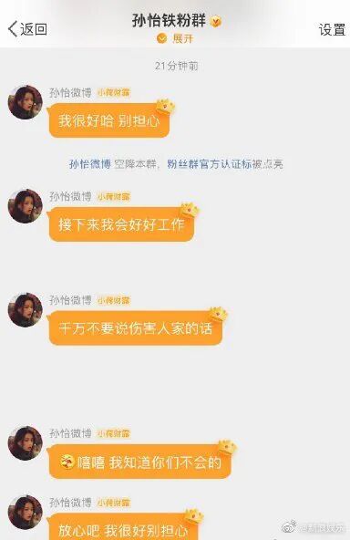 官宣离婚当天,孙怡就空降粉丝群,告诉自己的粉丝,让他们不要担心自己,并告知接下来自己会好好工作,最后还叮嘱了粉丝不要说伤害人家的话。