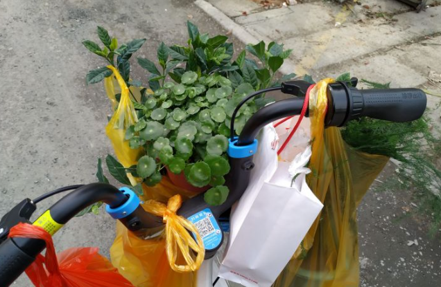 有时到附近市场采购,满满一辆共享单车的绿植,绝对把家里装点着绿意盎然。