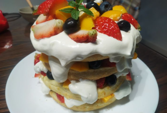 疫情期间,刚好碰上生日,女生就自己做了四层奶油水果蛋糕,味道也很不错。
