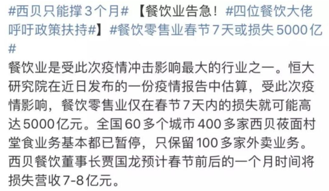 另一个餐饮巨头西贝莜面村,董事长贾国龙也公开表示,旗下的400多家连锁店,目前只保留10家,预计春节前后一个月将损失7-8个亿,账上现金根本撑不过3个月。
