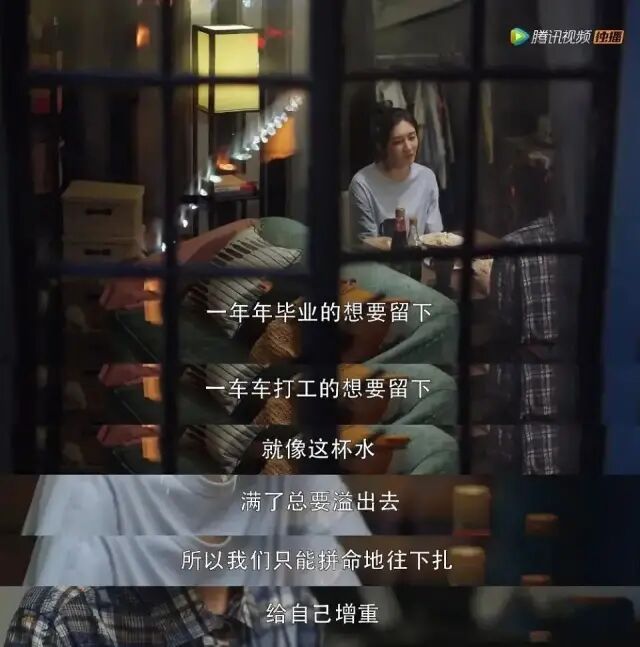 “一年年毕业的想要留下,一车车打工的想要留下,就像这杯水,满了总要溢出去,所以我们只能拼命地往下扎,给自己增重。”